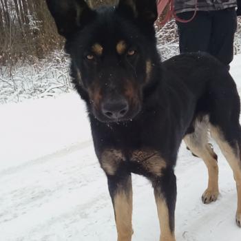 Król duży czarny mix owczarka niemieckiego, bardzo wychudzony, pogryziony z zaropiałymi ranami. Błąkał się ponad miesiąc po Miedzianej Górze. Zgłoszony przez gminę jako bardzo agresywny, rzucający się na ludzi, stanowiący zagrożenie pies. Widziany w różnych miejscach i przez dłuższy czas nieuchwytny. Próbowałam go odłowić 2 tygodnie. Zawsze jak przyjechałam już go nie było, znikał jak duch. Nie pomogło czekanie, klatka łapka (w którą nagminnie łapały się inne psy). Dobrze że znalazłam osobę która zgodziła się pomóc na miejscu (reszta mieszkańców stanowczo odmówiła współpracy). Po tygodniu karmienia udało się zamknąć "agresora" na ogrodzonym podwórku. Po przyjeździe okazało się, że to łagodny jak baranek olbrzym. Po 10 minutach podszedł do mnie i pozwolił zapiąć sobie obroże i smycz. King nie wykazuje żadnej agresji, bardzo garnie się do człowieka, pięknie chodzi na smyczy i jest wspaniałym, dostojnym psem. Musi trochę przytyć i muszą zagoić mu się rany, psychicznie bardzo szybko doszedł do siebie. Mam nadzieję że szybko znajdzie dom i swojego człowieka.