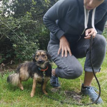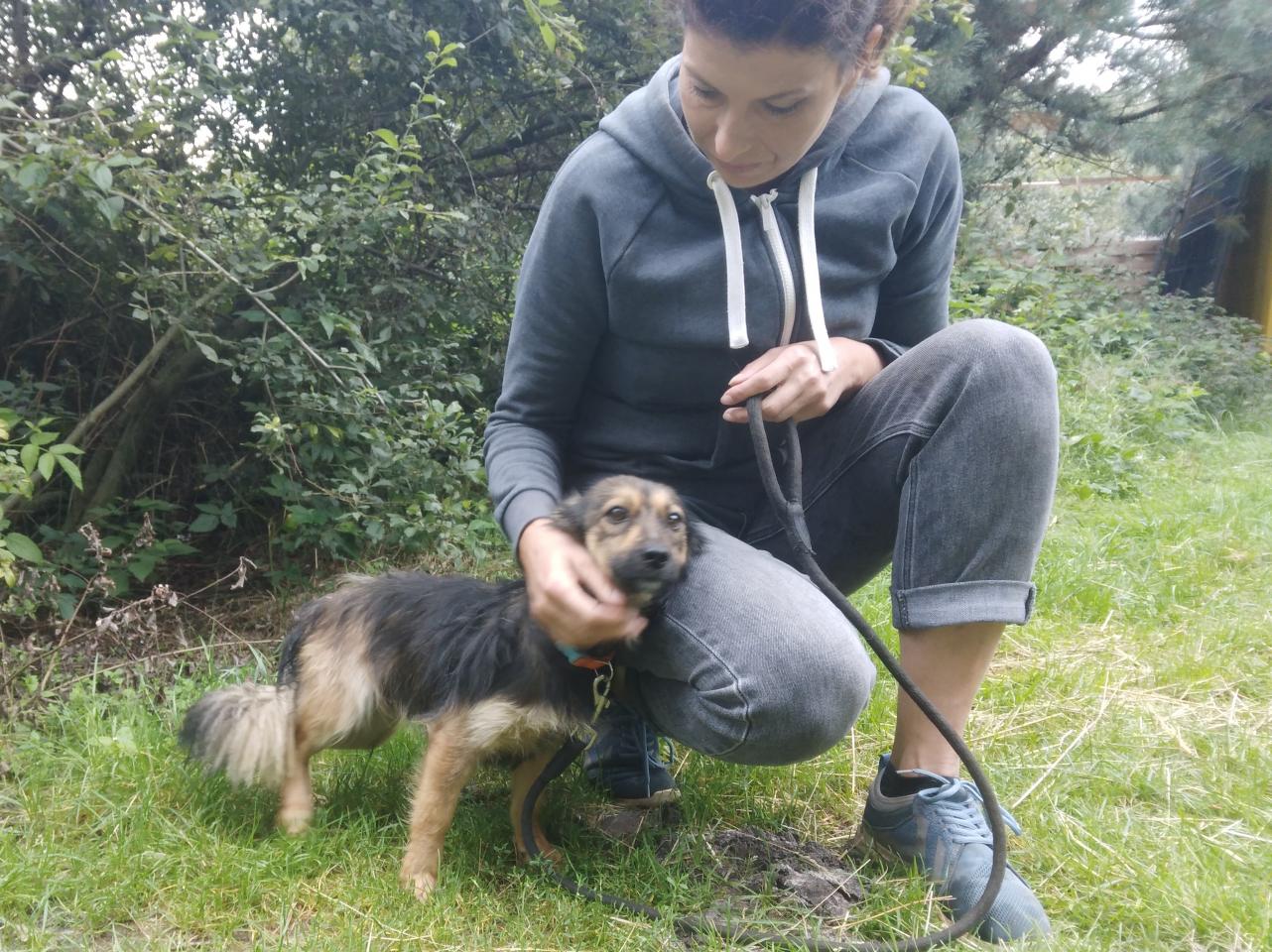 Perełka to filigranowa sunia ok 7 kg. W kontakcie z nowymi osobami jest trochę nieśmiała, ale dość szybko nabiera zaufania. Po chwili nadstawia się do pieszczot i pcha się na kolana. Podąża za człowiekiem, ale jeszcze nie umie chodzić na smyczy.