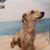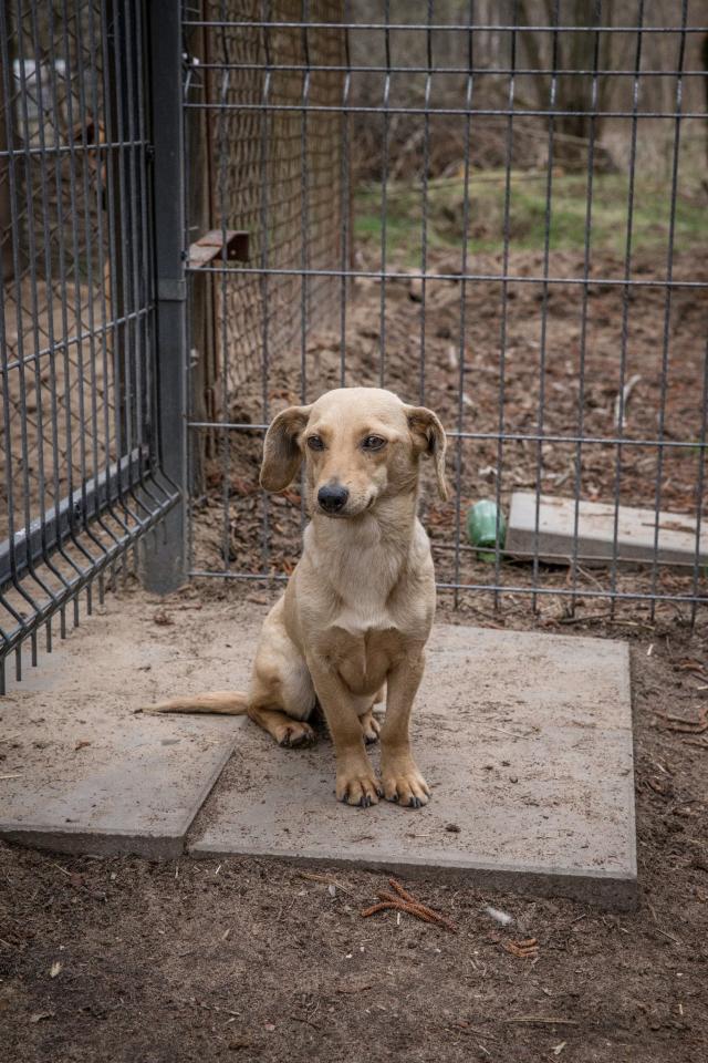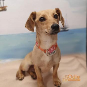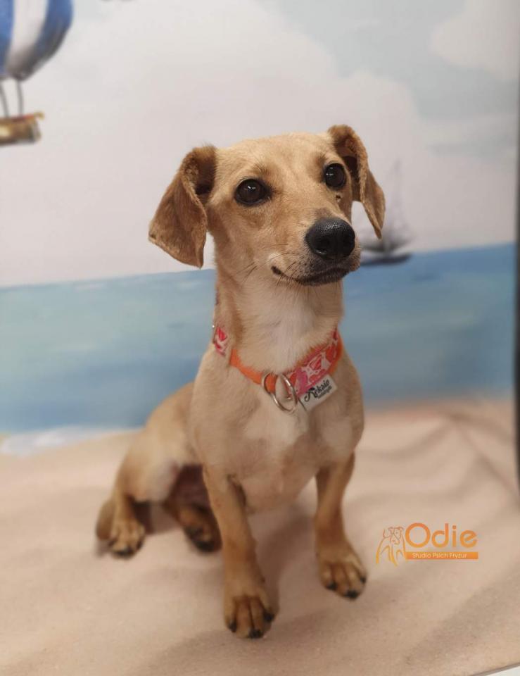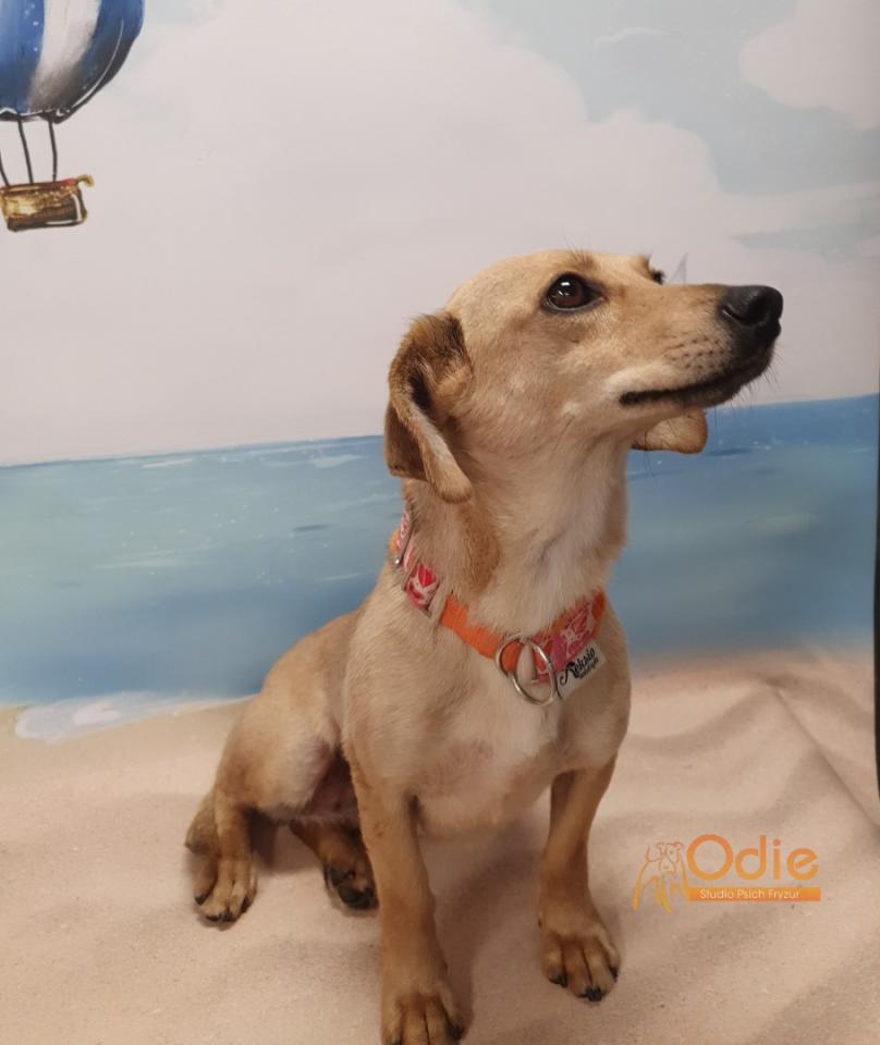 Młoda suczka w typie jamnika. Przebywa w domu tymczasowym. Dogaduje się z psami, łagodna w stosunku do ludzi, umie chodzić na smyczy.